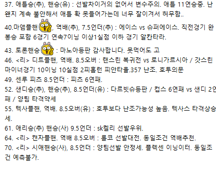 37. 애틀승(추), 핸승(유) : 선발차이거의 없어서 변수주의. 애틀 11연승중. 난 왠지 계속 불안해서 애틀 확 못들어가는데 너무 잘이겨서 허무함..