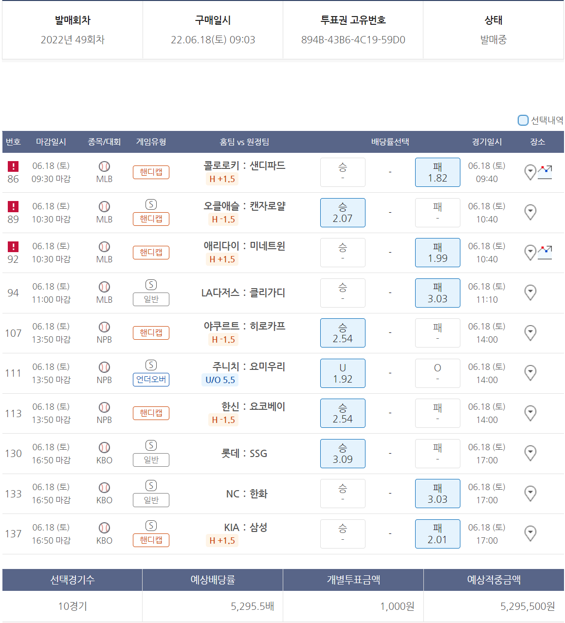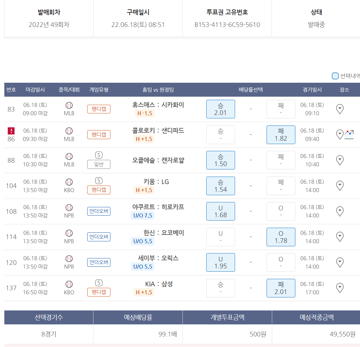 2022.06.17 - [야구/NBP 야구토토 분석] - 220617 승부식49회차 야구토토(적중)