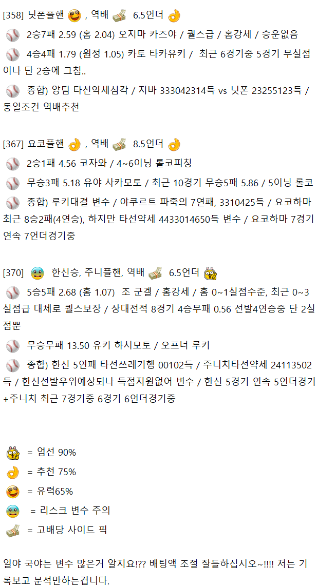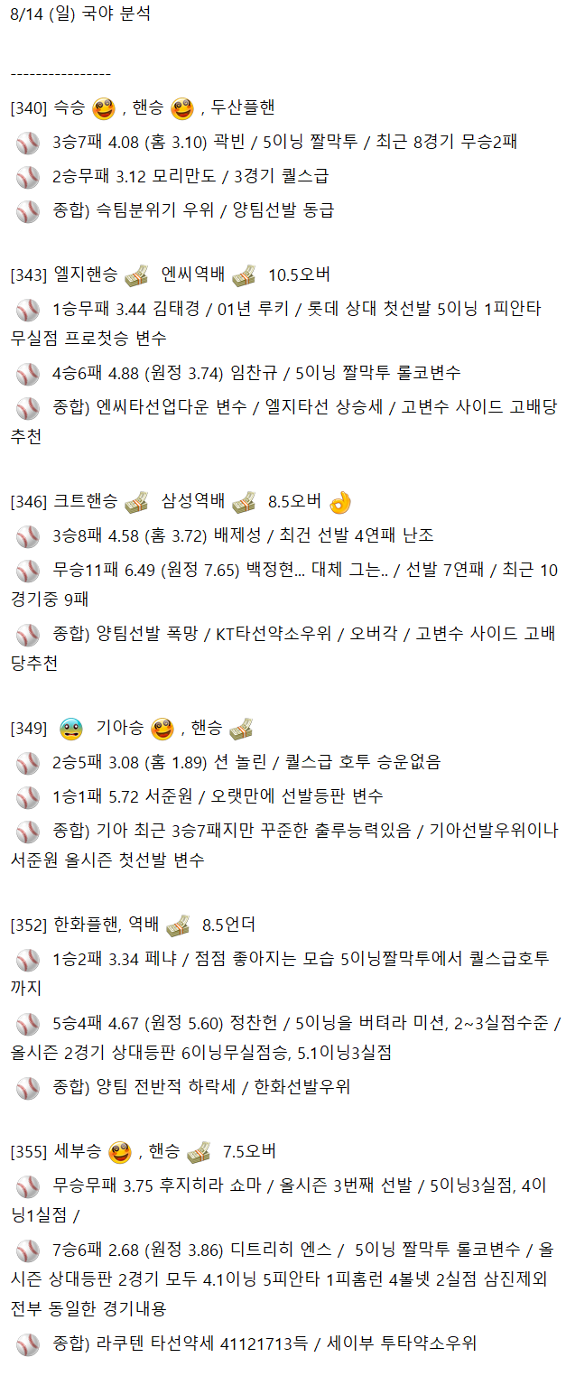 (야구) 종합) 엔씨타선업다운 변수 / 엘지타선 상승세 / 고변수 사이드 고배당추천