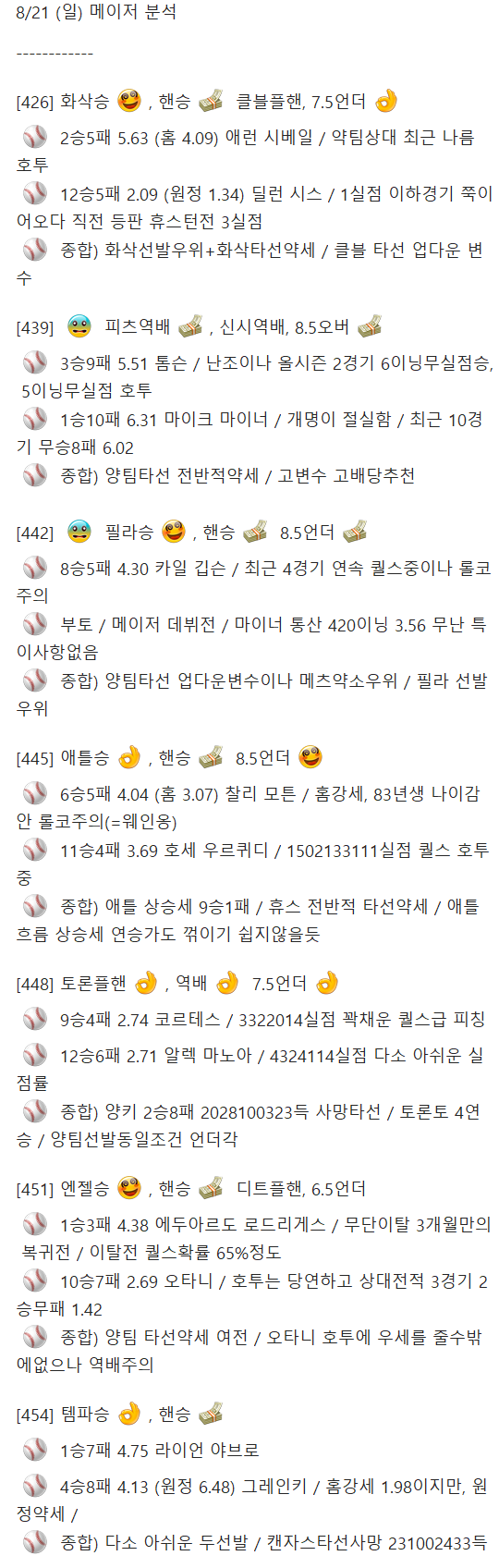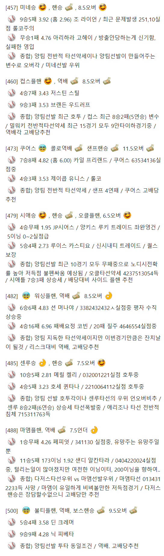 (야구) 종합) 화삭선발우위+화삭타선약세 / 클블 타선 업다운 변수