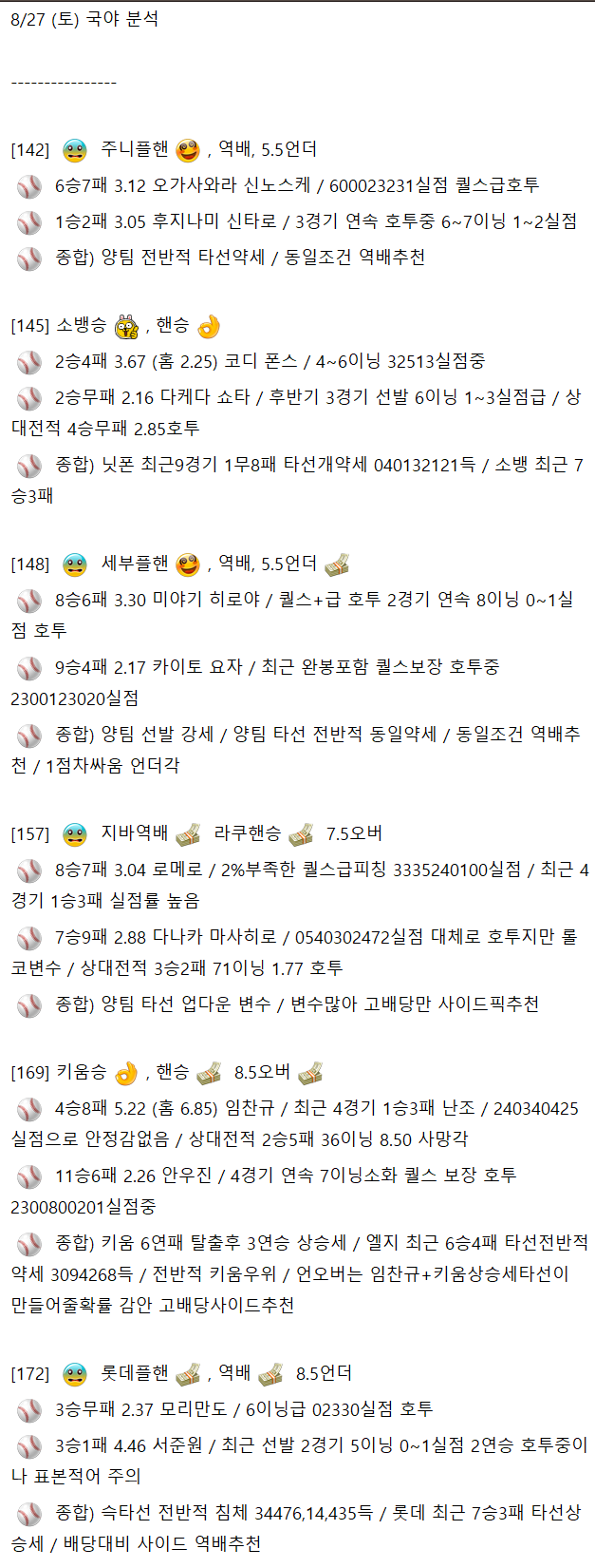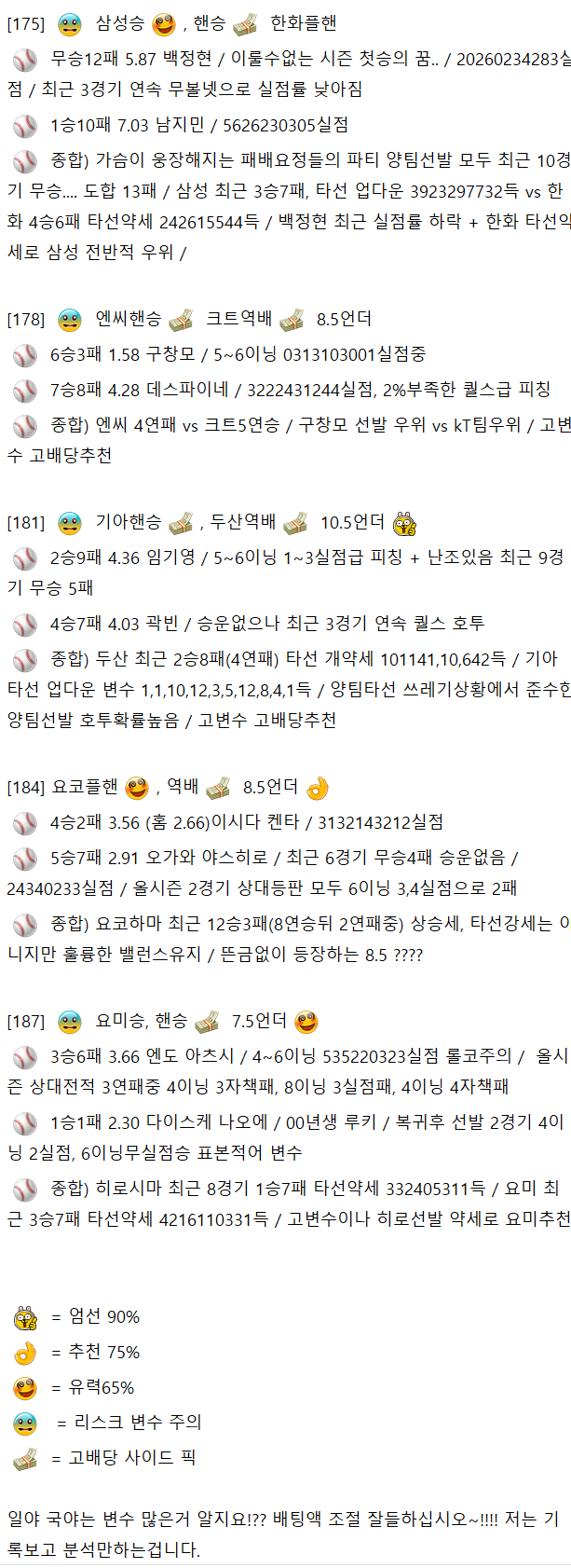 (야구) 종합) 양팀 선발 강세 / 양팀 타선 전반적 동일약세 / 동일조건 역배추천 / 1점차싸움 언더각