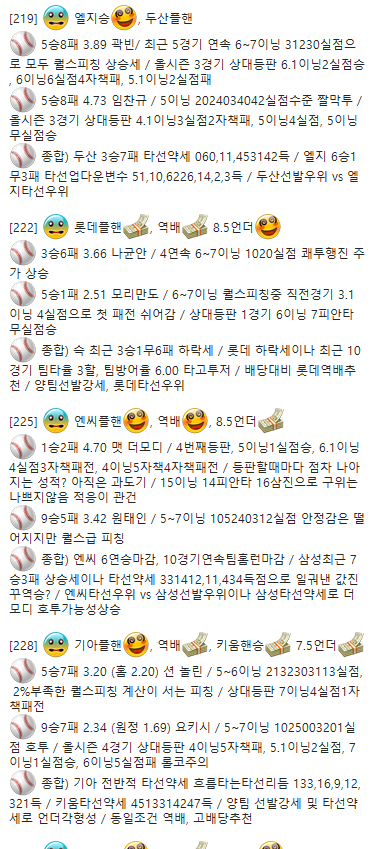 (야구) 종합) 기아 전반적 타선약세 흐름타는타선리듬 133,16,9,12,321득 / 키움타선약세 4513314247득 / 양팀 선발강세 및 타선약세로 언더각형성 / 동일조건 역배, 고배당추천