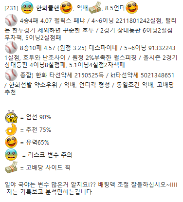 (야구) 종합) 한화 타선약세 2150525득 / kt타선약세 5021348651 / 한화선발 약소우위 / 역배, 언더각 형성 / 동일조건 역배, 고배당추천