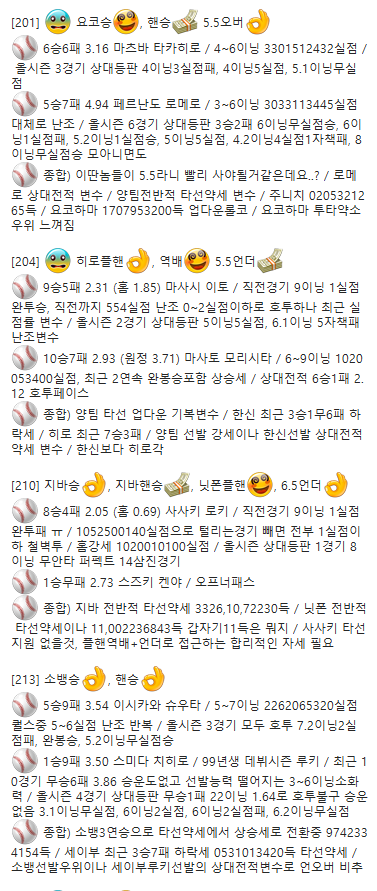 (야구) 8승4패 2.05 (홈 0.69) 사사키 로키 / 직전경기 9이닝 1실점 완투패 ㅠ / 1052500140실점으로 털리는경기 빼면 전부 1실점이하 철벽투 / 홈강세 1020010100실점 / 올시즌 상대등판 1경기 8이닝 무안타 퍼펙트 14삼진경기