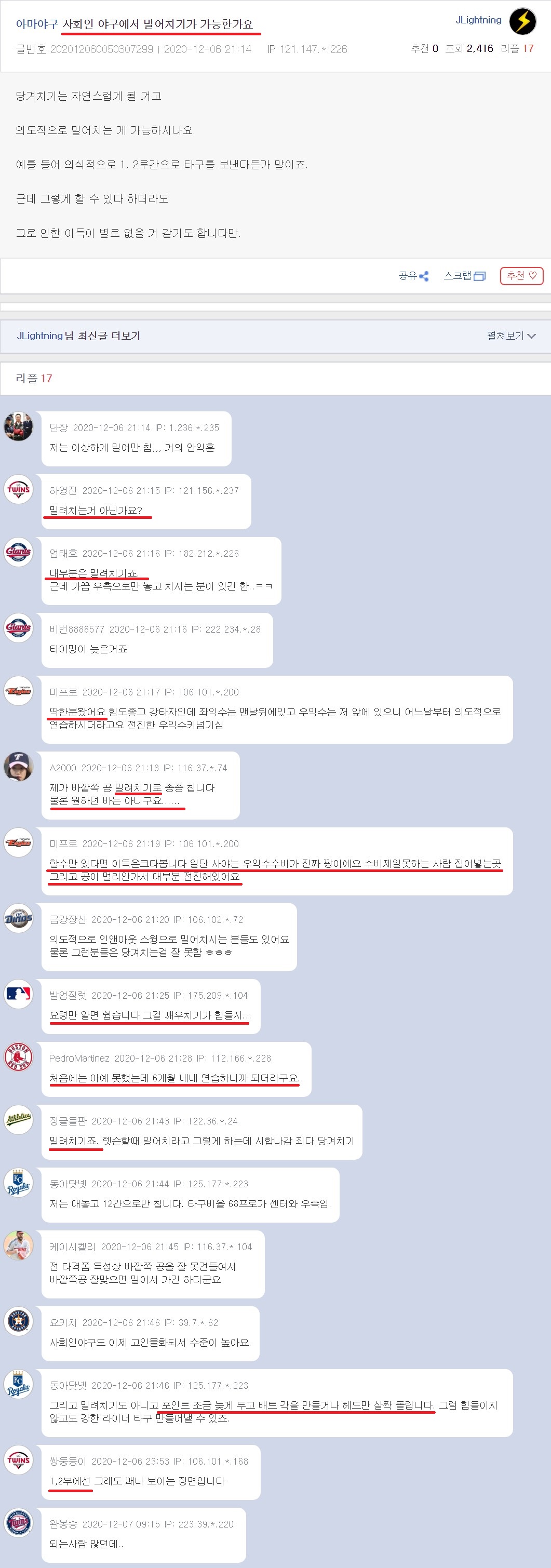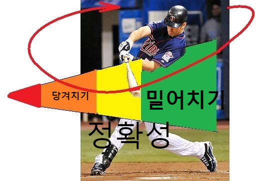 밀어치기를 하면 스트라이크만 정확히 칠 수 있다.