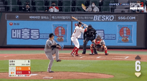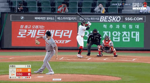 최지훈이 초구를 공략해서 기술적으로 낮은공을 걷어올려 1타점을 만회했다.