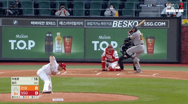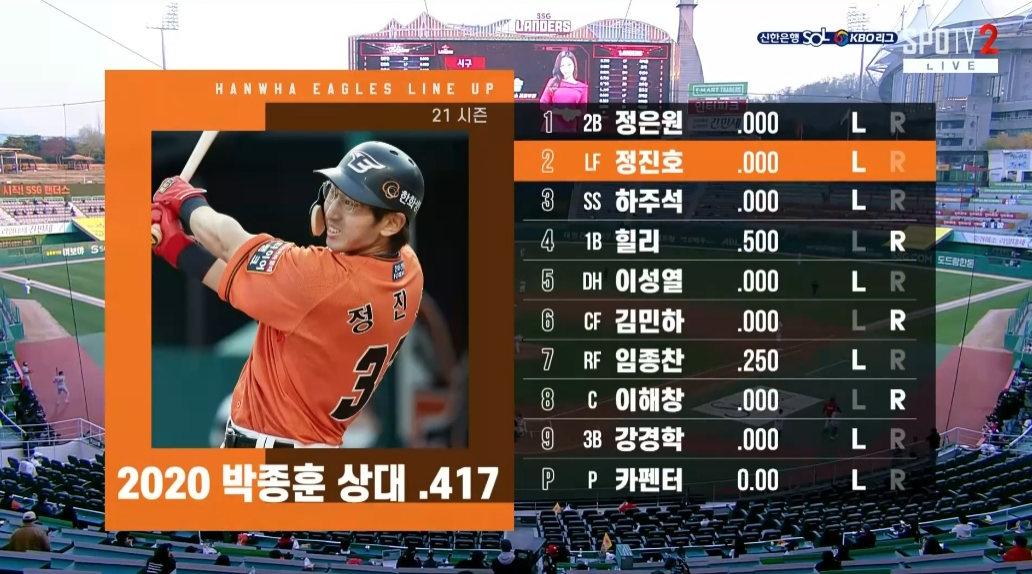 개막전 라인업과 비교해보면 가장 눈에 띄는 점은 역시 상대선발 박종훈을 겨냥해 우타자 노시환, 박정현, 유장혁, 장운호가 빠지고 좌타자 이성열, 정진호, 강경학을 배치했다는 점을 알 수 있습니다. 지난 경기 3명이였던 좌타자가 6명으로 대거 2배나 많아졌습니다. 데이터를 무시할수는 없지만 야구는 잘하는 사람이 잘한다고.. 감독들이 이런 일반화에 오류에 빠져서 공식처럼 좌우놀이에 집착하는 경향을 썩 반기지는 않습니다. 좌타자들이 과연 언더핸드인 박종훈을 상대로 결과를 낼 수 있을까요?