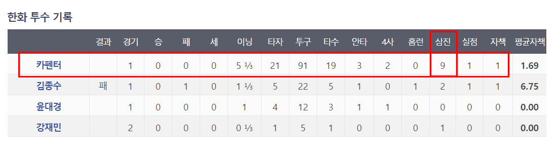 카펜터의 구위에 꽁꽁 묶였던 타자들이였지만