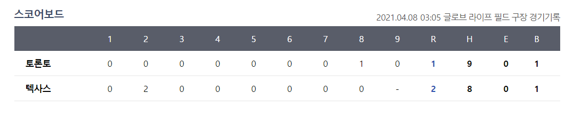 4월 2일 새벽2시 류현진이 시즌 2번째 등판을 했습니다. 상대는 양현종이 콜업을 기다리고 있는 마운드가 완전히 붕괴되있는 텍사스입니다. 토론토는 텍사스와의 마지막 3차전 경기인데, 앞선 2경기에서는 서로 1승1패를 주고 받았습니다. 텍사스 1선발 카일깁슨은 지난 등판에서 개막전 선발중책을 맡아 0.1이닝 그러니까 1아웃밖에 잡지 못하고 4피안타 3볼넷 5실점을하고 1회부터 강판당하게 되고 텍사스는 그 경기에서 14실점을 하게 됩니다. 반면 류현진은 개막전 선발을 양키스 원정에서 5.1이닝 동안 개리 산체스에게 투런홈런 한방만을 허용하며 양키스 타선을 훌륭히 억제하여 3-2 팀승리의 발판을 놓았습니다. 가볍게 예상하기로 이번 등판에서도 류현진의 호투와 깁슨의 빠른 강판이 예상되었습니다. 어렵지않게 류현진의 첫 승을 예상할 수 있었는데요. 뚜껑을 열어보니 그게 아니였습니다...
