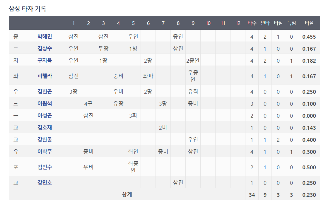 더많은 안타를 치고도 이기지 못한 삼성