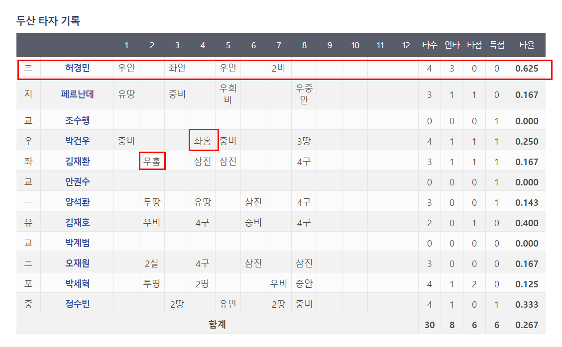 - 3번 우익수 박건우 우
