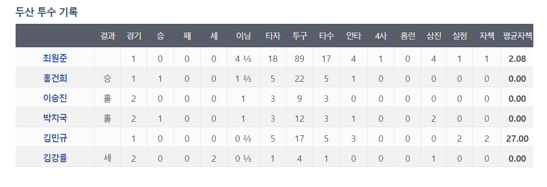 최원준의 투구수관리는 부족했지만 결과적으로 삼성타선을 잘 막아냈고, 이승진과 박치국이 중간부터 꼼꼼히 틀어막은 덕분에 경기를 쉽게 이길 수 있었다.