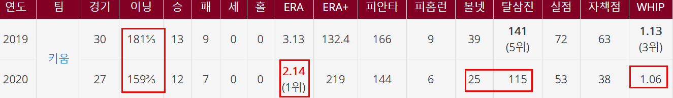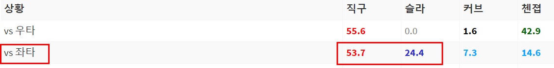 2020시즌 들어 구종 구사율을 보면 직구와 체인지업이 90%에 달한다. 커브는 유희관과 비슷한 100km 대의 아주 느린 공이기에 타이밍을 뺏는 용도로 간간히 던질뿐 결정구로 쓰기는 어렵다. 결국 좌타자 상대로 던질 슬라이더의 완성도가 중요한데 선발전향을 준비하는 과정에서 배영수 코치도 이 부분을 강조한듯하다. 하지만 선발로서의 모습은 선발 전향 과정에서의 준비부족인지 부상에 대한 부담인지 직구의 구속이 140km가 채 안되는 모습이다.