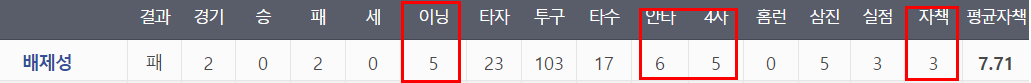 진작에 3~4회에 무너져도 이상하지 않았을 투구였는데, 두산 타선이 오늘은 집중력이 부족했습니다. 안타 6개와 볼넷 5개를 내주면서도 5회까지 투구를 끝마쳤다는데에 운이 정말 좋았다고 할 수 있을 정도입니다. 이번 경기 포함해서 배제성의 WHIP(이닝당 출루허용률)은 어느새 2.04까지 올랐습니다. 매 이닝당 2명씩 출루시키는 투수입니다..