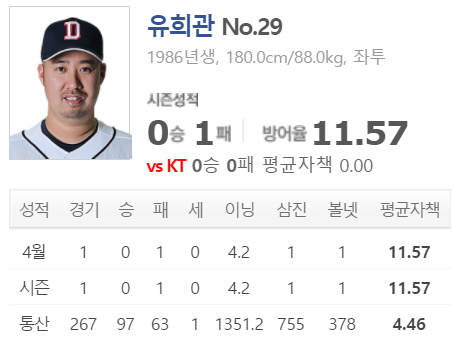 대체로 좋았던 기억이 없습니다. KT상대로 유희관은 좋지 못했습니다. 특별히 유희관이 더이상 준비한다고 한들 갑자기 구속과 구위가 좋아질 일도 없거니와 오히려 제구마저 무너지면 무너졌지 더 나빠질일 밖에 없기 때문에, 4이닝 4~5실점 정도 예상해봅니다.