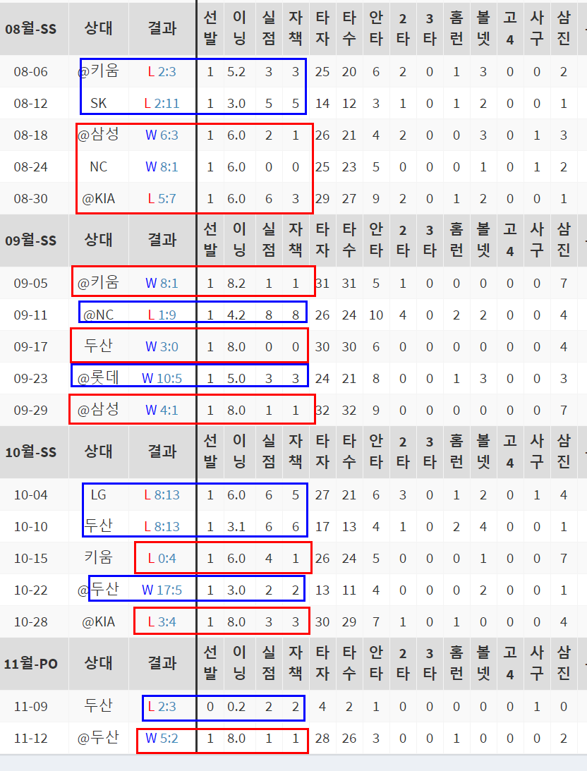 5월 8일 - 4이닝 5실점 / 6월 2일 - 6이닝 4실점 / 8월 16일 - 5.2이닝 2자책 9피안타 / 9월 17일 1.2이닝 3실점 / 10월 22일 - 5이닝 2자책 7피안타 / 11월 13일 플레이오프 선발 0.1이닝 3피안타 강판 /