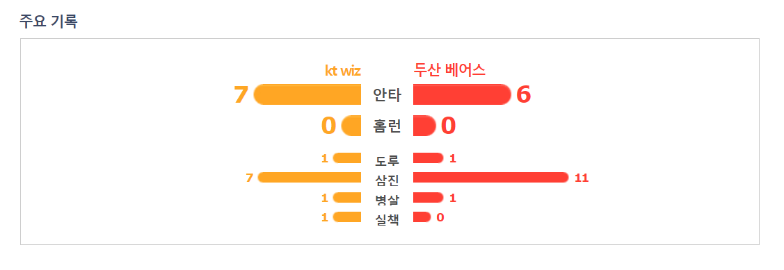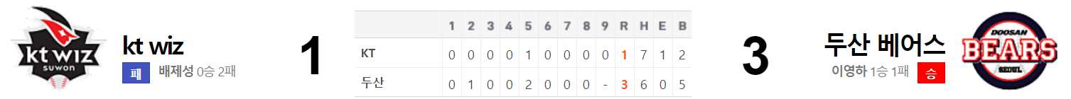 초반에 배제성을 일찌감찌 무너뜨렸다면, 중반부터 KT 추격조 불펜이 가동되면서 탈탈 털리면서 두산이 다득점 경기를 가져갈수있는 그림을 원했지만, 두산이 멀리 도망가지 못하게 되면서 KT역시 필승조가 가동되면서 타선이 꽁꽁 묶이며 배제성을 상대로 흠집만 낸상태로 경기가 끝났습니다.