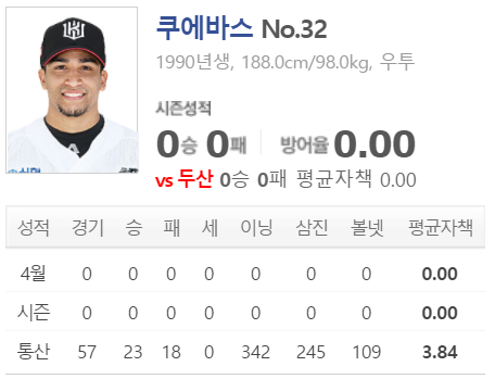 상대 투수 쿠에바스는 볼넷이 없는 유형입니다. 칠테면 쳐봐라 식으로 존을 공격적으로 꽂습니다. 두산타선이 말려들면 땅볼에 병살위험때문에 출루를 많이 하고도 득점을 뽑아내기 어려울 수 있습니다. 다만 쿠에바스는 워낙 롤러코스터 피칭을 하는 타입이지만 대체로 두산에 호투한 기억도 많은 투수입니다. 두산 타자들 컨디션도 왔다갔다 하기때문에 예측하기 난감합니다..
