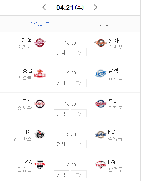 2021년 4월 21일 수요일 야구토토 KBO 5경기 승무패 분석