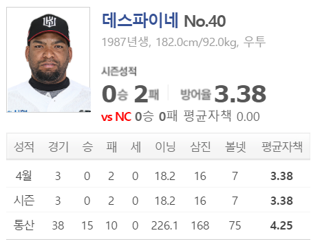 데스파이네의 NC전 기록은 5이닝 3실점 / 6이닝 4실점 / 4.2이닝 8실점 / 6.2이닝 1실점 대체로 좋지 못한 기록을 남겼습니다.