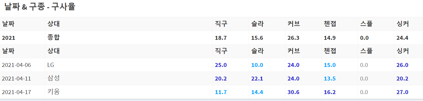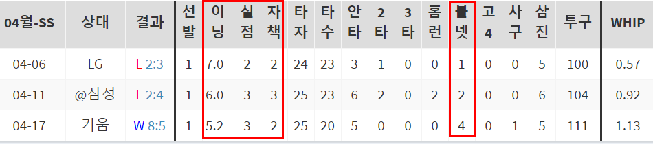 올해도 마찬가지로 외국인 투수에게 기대하는 평균 6이닝은 버텨주며 퀄리티스타트를 보장하는 모습입니다. 지난 등판에서 볼넷이 다소 많아 6이닝은 채우지 못했지만, 제역할은 충분히 했다고 생각합니다.