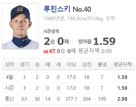 루친스키는 KT와의 대결에서 19년부터 등판 기록을 보면 7이닝2실점 / 4.1이닝 6실점 / 5이닝 1실점 / 5.1이닝 5실점 / 7이닝 3실점 / 7이닝 2실점 / 5이닝 7실점 / 6.2이닝 1실점으로 5번은 호투, 3번은 크게 무너진 전적이 있습니다.