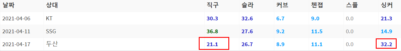 지난 등판에서 포심의 비율이 매우 낮았던 것을 확인할 수 있다.