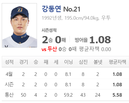 주무기인 포크볼이 굉장히 위력적인 투수입니다. 항상 그렇듯이 포크볼을 제대로만 던진다면 치기 어려운 구종인 만큼 강동연이 얼마나 자신의 공을 잘던지는지가 가장 중요합니다. 지난 SSG와의 경기 당시엔 타자들의 컨디션이 최악일때였기때문에 호투를 하기에 좋은 조건이였습니다. 이번 두산전에서 제 몫을 해낸다면 확실히 좋은 투수라는 인식을 심어줄수 있습니다. 다만, 아직 경험이 부족하고 선발투수로 성장해나가는 과정이기 때문에 위기상황에서 얼마나 잘 넘어가느냐가 관건으로 보입니다.