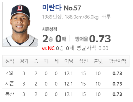 지난 3번의 등판 모두 내용적으로 불합격이지만, 공교롭게도 결과는 좋다. 두산은 미란다를 1선발로 보고 영입했으나 실제로는 다른 외국인선발 '로켓'이 그 역할을 하고 있다. 기대치가 있는 만큼 아직 개선의 여지가 있다고 보여진다. 공이 날리는 것을 NC타자들이 놓치지 않고 양의지나 박석민같은 터무니없는 스윙에게 걸린다면 첫 피홈런을 허용할 가능성도 높다.
