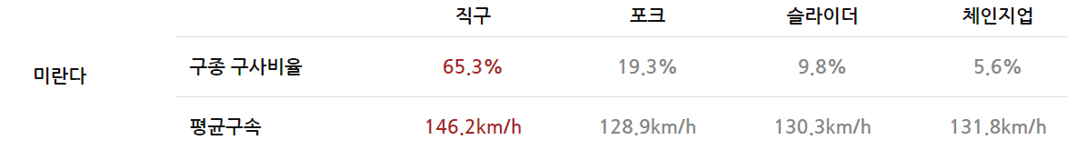 직구 구사율이 점점 올라간다. 직구만으로도 통할수있는 투수라는 점에서 매력적이지만, 투구수와 이닝을 보면 그만큼 도망다니는 피칭을 하고 있다는 증거이기도 하다. 직구로 볼질하는 투수. 지난주 내내 지켜본 NC타자들은 대체로 인내심이 없었다. 분명히 NC타자들에게 기회는 온다. 점수를 낼지 말지는 미란다가 아닌 NC타자들에게 달려있다.