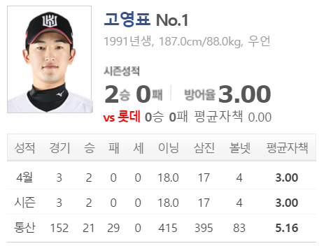 춤추는 체인지업과 패스트볼조합만으로도 상대 타선을 완벽하게 틀어막는다. 더이상 말이 필요없는 투수가 되었다. 믿기지 않는다면 지난 경기 영상을 찾아보시라. 평균적으로 한이닝 정도만 더막아준다면 더할나위없이 완벽한 국가대표용 투수라고 할 정도다. 롯데의 불붙은 타선을 잠재울 고영표의 등판이다. 그동안 KT는 박세웅에게 얼마나 많은 점수를 뽑아낼수있을까? 또 고영표가 내려간이후의 KT불펜과의 온도차는 얼마나 클지?