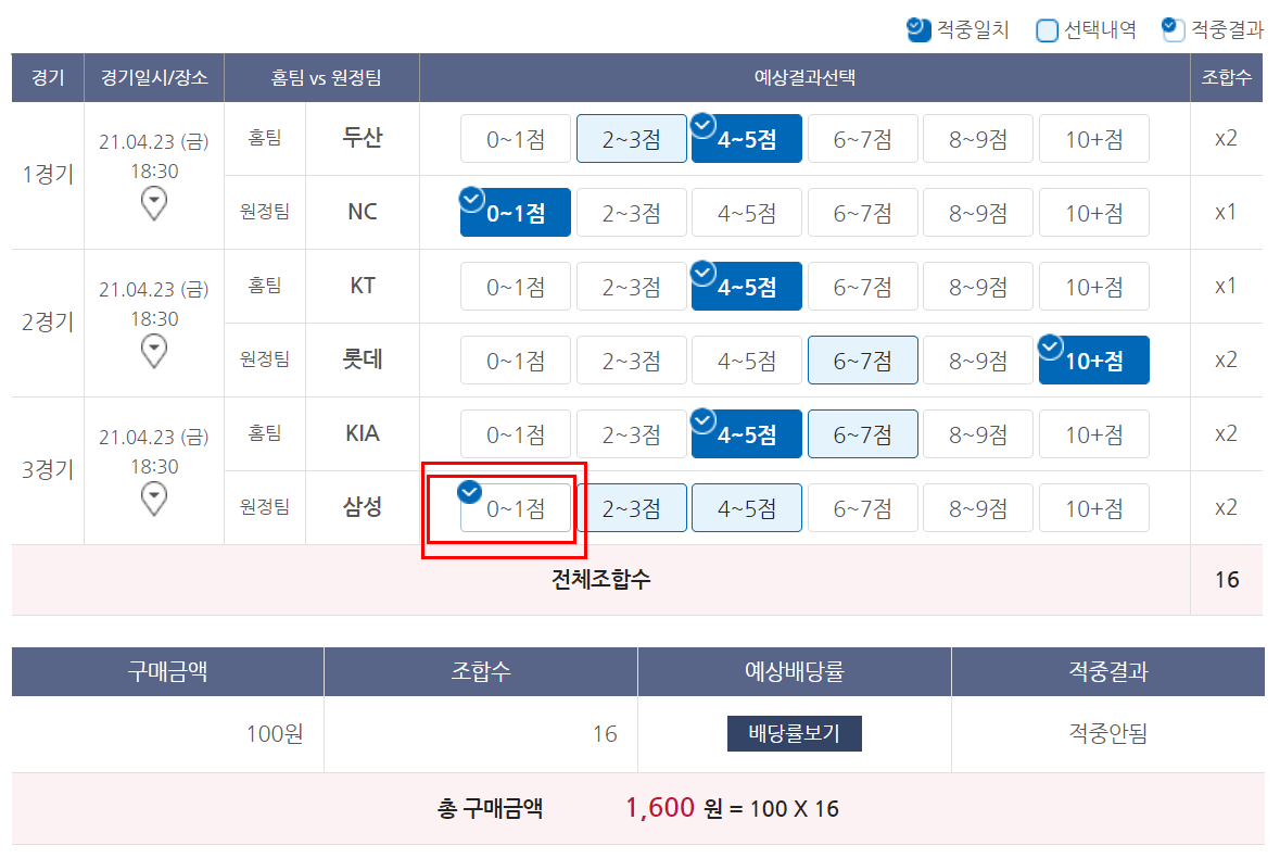 4월 24일 토요일 야구토토 스페셜 트리플 16회차