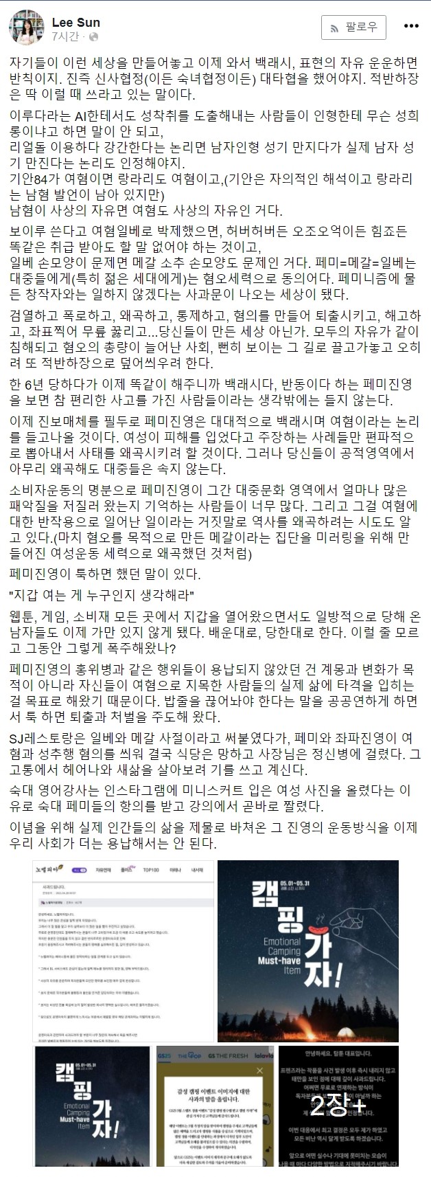 어느 커뮤니티를 가도 유튜브를 틀어도 '페미'관련 내용은 빠지지않고 핫이슈로 사람들의 입방아에 오르내리고 있습니다. 페미의 시대를 살고있는 현재, 옛날같으면 아무것도 아닌일이였을 일에, 참다지친 남자들이 하나둘 들고 일어서고 있는데 김민아 아나운서의 청소년에게 섹드립을 치던 것과 박나래의 유튜브에서의 성적인행위를 연상시키는 행동 등이 문제로 지적되면서 사회적 파장을 일으키게 되었고, 결정적으로 이번엔 기업 내까지 자리잡은 페미니즘으로 문제가 된 GS사태로 인해 많은 GS점주들이 피해를 보고있지만, 소비자들은 확실한 선례를 남겨서 잘못된 페미문화를 바로 잡을수있도록 눈에 불을켜고 불매운동을 강행하고 있습니다.