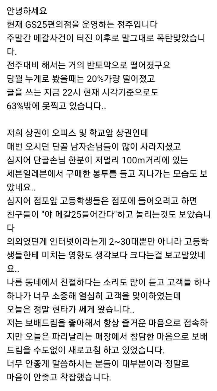 GS는 현재 잘못했다고 전혀 생각하고 있지 않다. 이에 여론은 강경한 불매운동의 의지를 확산시키고 현재 GS편의점주들은 곤란한 상태에 이르렀다.